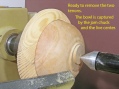 If you don’t have Cole jaws, another “safe” way to do it is to prepare a jam chuck with a hollow that the bowl will fit into. This will trap the bowl and keep it from moving sideways as it will want to do because it is out of balance.