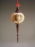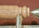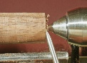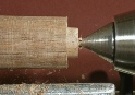 The black walnut blank is about 1” in diameter and is mounted between a scroll chuck and the tail center. The first steps are to square the end of the blank, incise a line, and then form the tenon that will be used to attach the completed piece to the globe of an ornament.