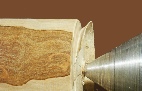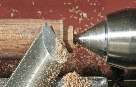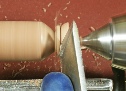 A planing cut is then used to reduce the diameter of the blank a small amount and produce a clean surface at the very end. The cutting edge will be advanced beyond the end of the blank a small amount. Next, a spindle gouge is used to remove waste wood, and then the heel of the skew is used to form the convex surface of the base.