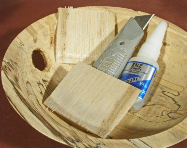 A built-up fill. If a large hole goes all the way through the side of a bowl, I will often cut strips of wood to wedge into the hole to form a foundation for the epoxy. Balsa works fine for this and is easy to cut and shape. Once a piece is wedged into the hole, a drop of thin CA will lock it in place. One big advantage of doing the buildup is that it makes the epoxy filler easier to apply, and the process goes fairly quickly.