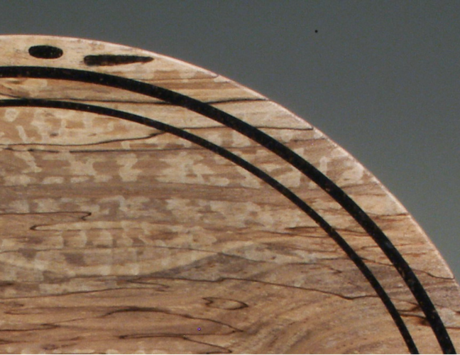 Preparing the workpiece. At first, let’s assume we have a bowl turned from sound wood except for a couple of worm holes on its outside surface that we plan to fill. My preference is to go ahead and sand the outside to completion while it is still on the lathe. Further, I will brush on a coat of lacquer sanding sealer and let it dry. The sealer ensures that no stain or discoloration will occur next to the holes to be filled. It doesn’t seem to matter if a bit of sealer runs into the holes.