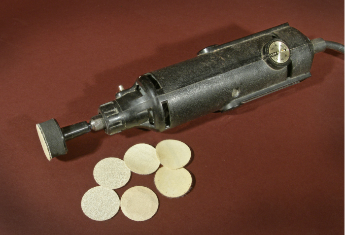 with the surrounding wood. Go through the grits as you normally do. I almost always use a sanding pad mounted in the chuck of a drill (power sanding) and concentrate on the filled area. For small voids, I find 1” disks held by a Dremel tool to be quite effective.