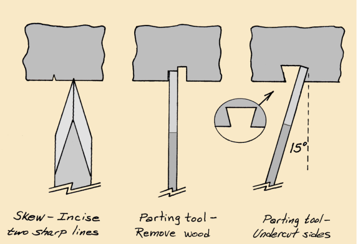 A parting tool is used to cut the groove because the grooves are usually too narrow for a gouge. However, most parting tools do not produce sharp, crisp edges which are needed for the ring to look good. This issue can be avoided by using the long point of a skew to incise a sharp line at each edge, then use the parting tool to remove the wood between the lines.