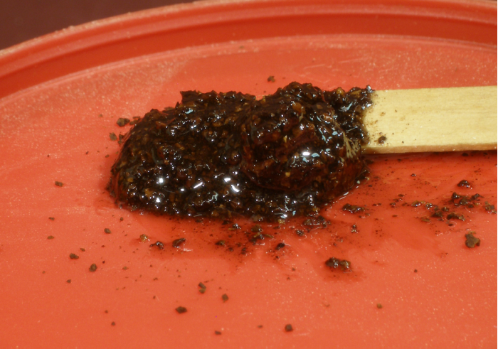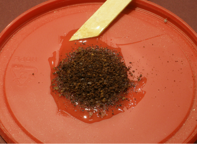 Adding the coffee. I pour the coffee grounds onto the puddle and then use the mixing stick to press the coffee down into the epoxy. Then I work the mix until all the coffee is wetted with epoxy. If the mix appears thin and syrupy, I add more coffee until I finally get a mix that is fairly stiff and granular-looking. As long as the epoxy wets all the coffee, it will be OK; getting it too stiff is not really a problem.