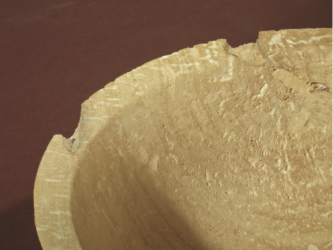 Because the hole is nearly circular, I was able to bridge the entire hole with one piece of balsa, which usually is not possible. It is surprisingly strong. On the inside, I tacked in two additional pieces of balsa and then packed in fine sawdust to fill part of the volume. The surface of the balsa and sawdust filler is at least 1/8” below the contour of the bowl even though that is hard to see in the photo.