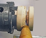 Then all that remained was to make a narrow cut the rest of the way through to part off the blank. At first, all went well. The tool was cutting like a knife through butter so I didn’t bother to widen the cut to give clearance for the parting tool. I pushed on.