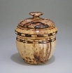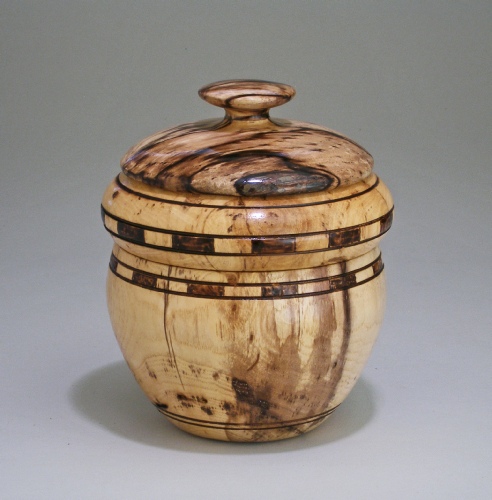 A box made of stackable sections. Beech, 5” h, 4” d, with pyrography.