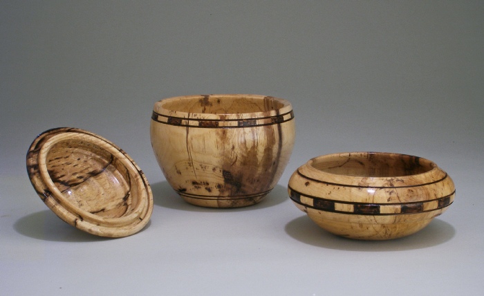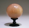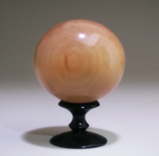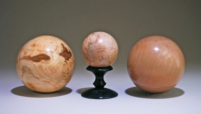 Left, a ball 3” d turned from gum, resting on a maple stand colored with india ink. Right, an ash ball 3.25” d, an ash ball 2” d on the stand, and the gum ball shown in the photo at left.