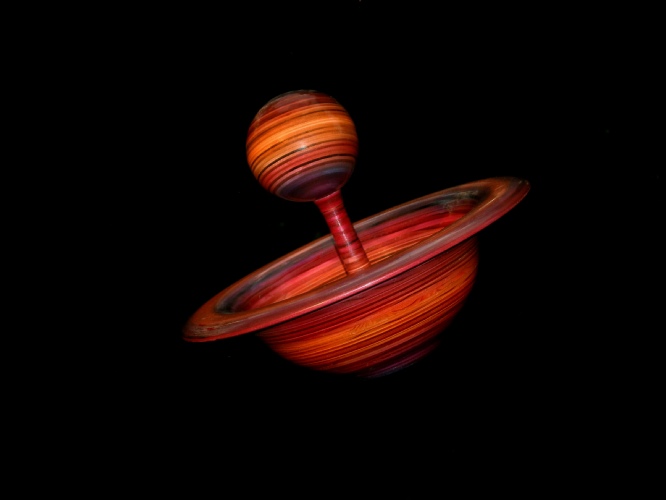 Another challenge was to make something out of plywood. I decided to make a Ball ‘n’ Bowl, a bit of a play on words. However, it developed into something astronomical, which I enhanced with airbrushed colors. The ball is hollow, 4” d. Bowl is 13” d, 4.5” h. Overall height is 11”. The pedestal for the ball is reinforced with a 1/4” dowel.