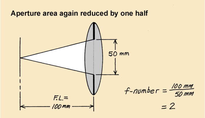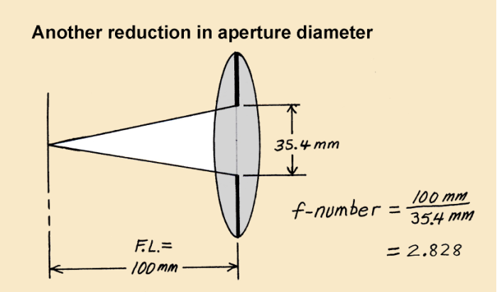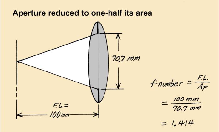 Suppose we reduce the aperture diameter enough to cut the area, and light transmission, in half. From the explanation above, we should divide the diameter by the square root of two, which is 1.414: