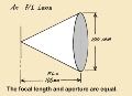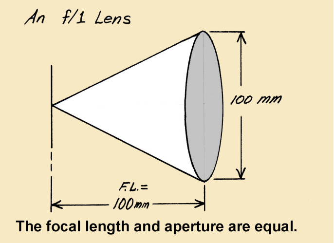 Suppose we have an unusual lens, one whose diameter (maximum aperture) is the same as its focal length. We’ll take the diameter and focal length to be 100 mm just to be specific. This represents a sizable chunk of glass because 100 mm is just about 4”.