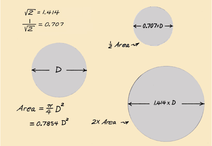 What must you do to the diameter of a circle in order to double the area? Multiply by 2? No. That would make the area 4 times greater because the area varies as the square of the diameter.