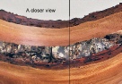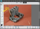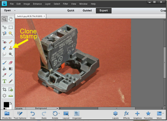 The two images below illustrate the effect of burning. The one on the left is the switch after we removed the sawdust. The foreground is rather bright. The one on the right is the same image after burning the foreground (and using the clone/stamp tool to remove a couple of conflicting shadows).