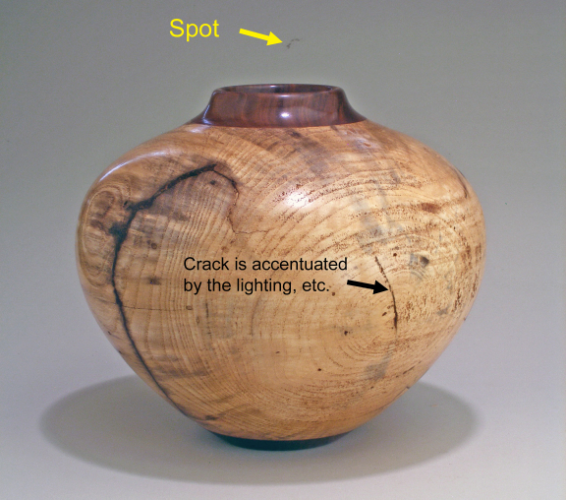 While eliminating a crack completely might be taking the concept of artistic license a bit too far, sometimes, depending on the lighting, a crack or void in a turning will register in the image very much more prominently than it appears in real life. The clone/stamp tool can be used to tone it down.