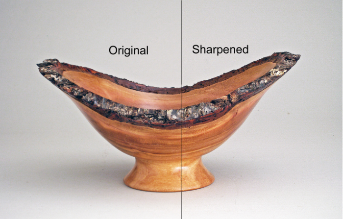 Here’s a “split image” of a natural edge bowl that has been sharpened just about as much as possible before artifacts begin to appear.