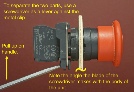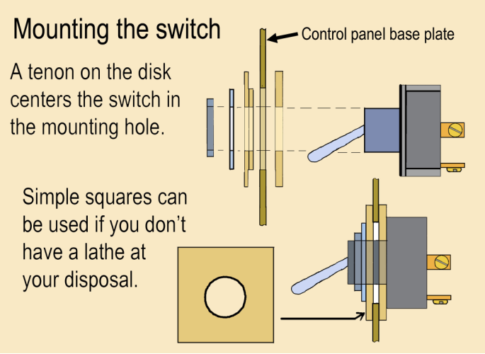 Remove the big red knob and mount the toggle switch in the 7/8” hole. Two thin disks (or squares) are required, with a hole at their centers for the toggle switch mounting stud to pass through. The mounting nut of the toggle switch will tighten against the disks and pull them up tight against the periphery of the hole. Details for making the disks are given below.