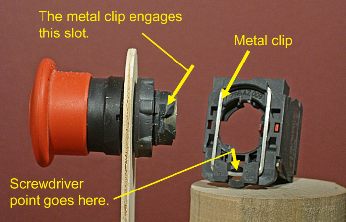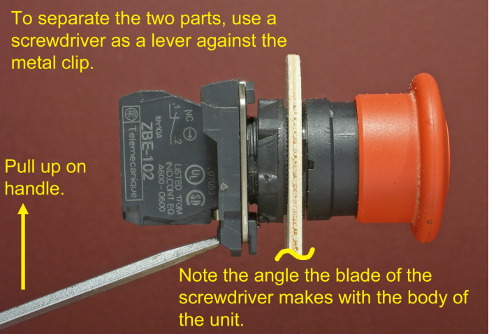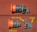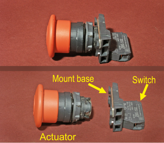 The unit consists of three parts: the mushroom actuator (the knob part), the mount base (or mounting collar), and the switch. To remove the unit from the panel, the actuator and mount base must be separated.