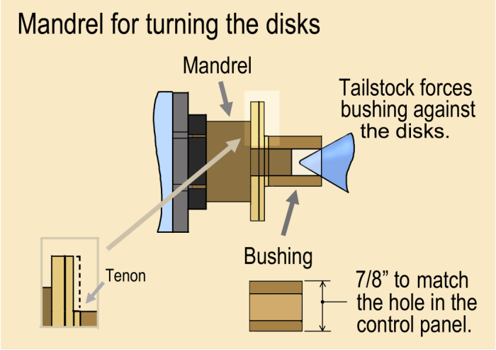 Turn the disks. Place the two blanks on the mandrel and use the bushing and tailstock to hold them in place. Turn them round, then cut a narrow tenon (1/16” or less) on one of the disks. Make the tenon diameter 7/8”, the same size as the bushing.