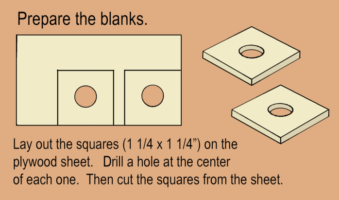 Drill a hole at the center of each blank (typically 15/32” diameter) for the threaded