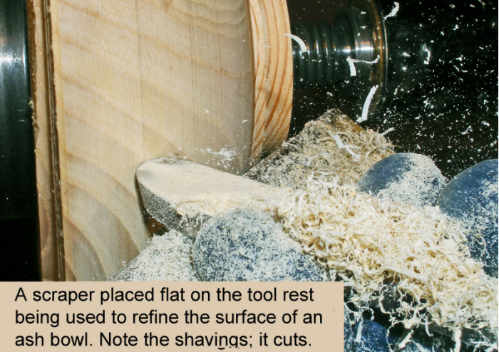 One approach to using a scraper is to place it flat on the tool rest and nudge it