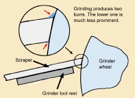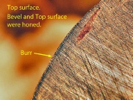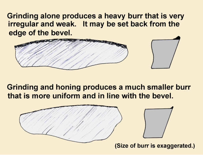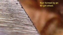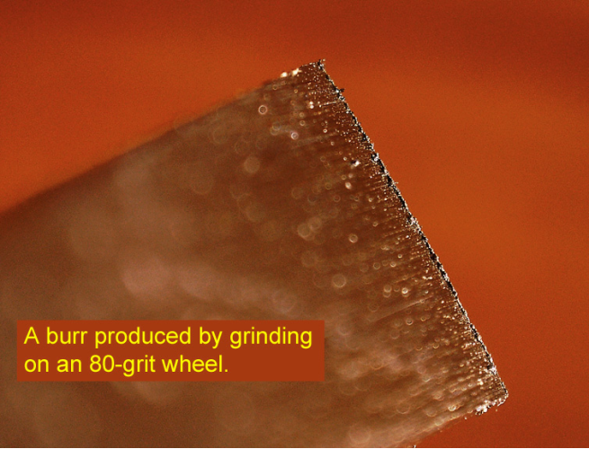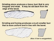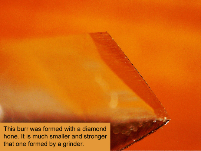 This also will produce a burr at the cutting edge, but one much smaller than what resulted from the grinder. Again, it is removed by honing the top surface.