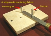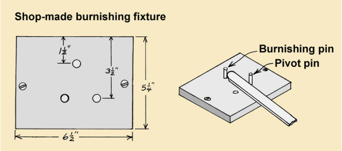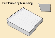 Another way to produce a burr is by burnishing. This involves forcing a keen cutting edge against a hardened steel pin (a burnisher) in order to deform the metal and push it up into a burr. Such a burr is distinctly different from one produced by grinding or honing even though the overall shape and size may be similar.