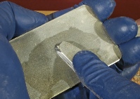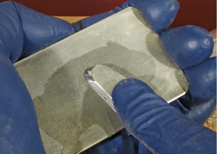 This will produce a prominent burr at the cutting edge, but this is not the burr we want. So it is removed by honing the top surface with a diamond hone, keeping the hone dead flat on the surface.