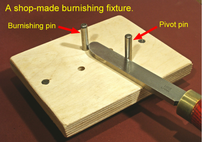 Up to the last step, this procedure is the same as that for grinding and honing. Then you do the burnishing, which means running the cutting edge past a steel rod to form the burr.