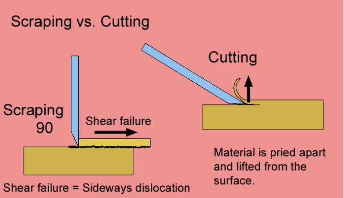 This has to do with the angle the cutting edge makes with the surface. If the angle is 90° or more, it is scraping. If it is less than 90°, it is cutting. Maybe.