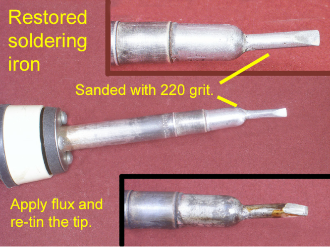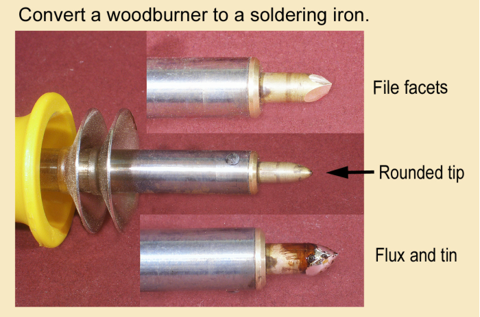 Because the tip of a woodburning iron is made of copper or brass, you can convert one you don’t use to a soldering iron. Just follow the procedure above for restoring a burned iron. If the tip is rounded initially, file facets on it for better contact and heat transfer to the work.