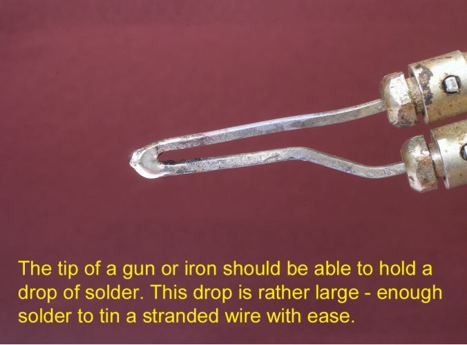 Note in the above that the solder was carried to the work by the tip of the gun or iron. The solder from the spool was never touched to the wire being tinned.