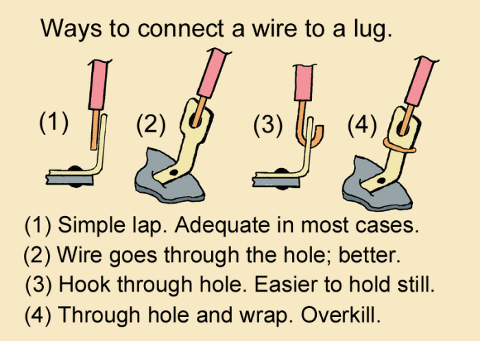 Again, this is no big deal. The diagram at right shows four options for the mechanical connection whose main purpose is to hold the wire in place and stationary while you do the soldering. Mechanical strength of the final joint is not a concern because if the solder flows the way it should, the joint will be stronger than the original wire.