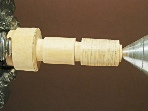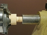 1. Mount a piece of spindle stock about 3.5” long between centers and turn it to a diameter of about 1.25”. Turn a shallow tenon on the tailstock en