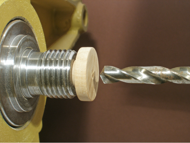 Be sure the drill bit centers on the squared face of the collet. Use a center drill to mark the center if you have one, or turn a small dimple to help center the bit. Drill the hole to a depth of about 1.5”.