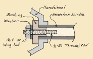 A drawbar consists of an appropriate length of 1/4-20 threaded rod and a “nut” to tighten it against the handwheel. Many variations are possible, but the one thing each must do, in addition to pulling on the collet, is to keep the rod centered at the handwheel end.