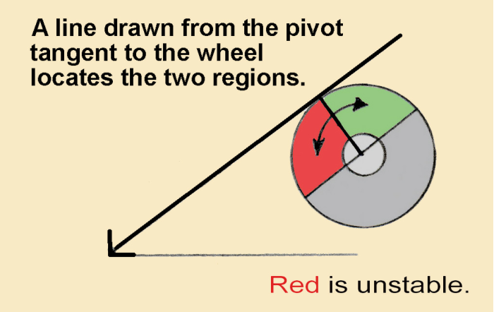 Stable or unstable? There is an easy way to tell if the configuration of the angled jig is stable or unstable. Imagine a line drawn tangent to the grinding wheel where the bevel of the tool makes contact. If this line passes above the pivot point of the jig, the situation will be stable. If it passes below the pivot, it will be unstable.