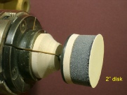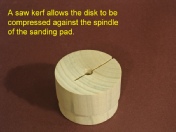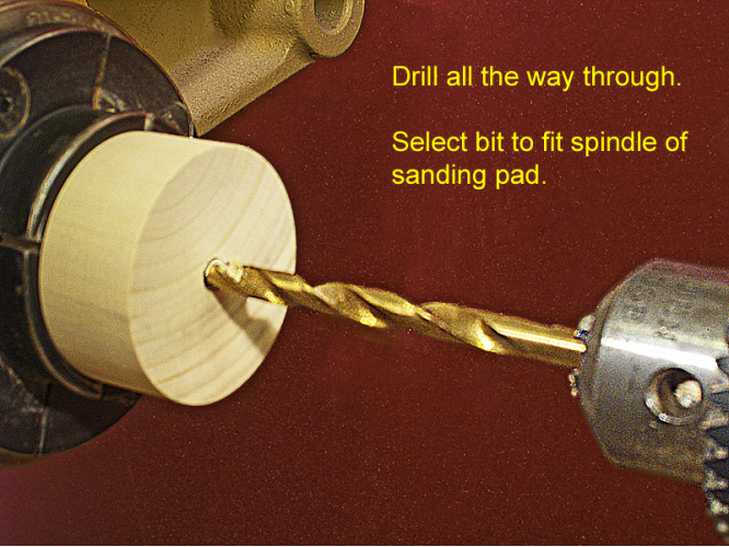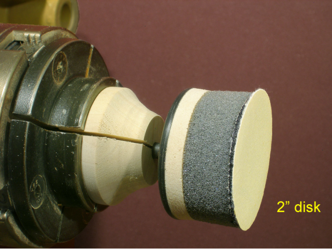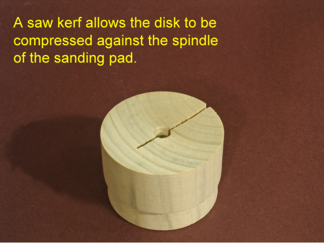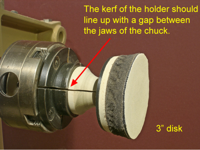 It’s a simple matter to make a holder for a sanding pad so the pad can be mounted on the lathe. The gist of the holder is a disk held by a scroll chuck. The spindle of the sanding pad is inserted into a hole in the disk. The clamping pressure of the chuck jaws locks the pad in place.