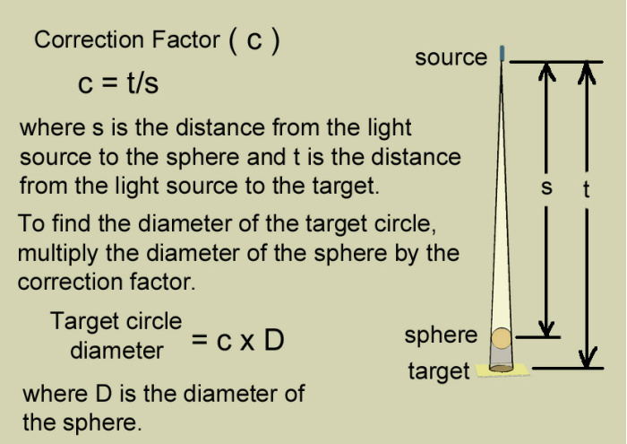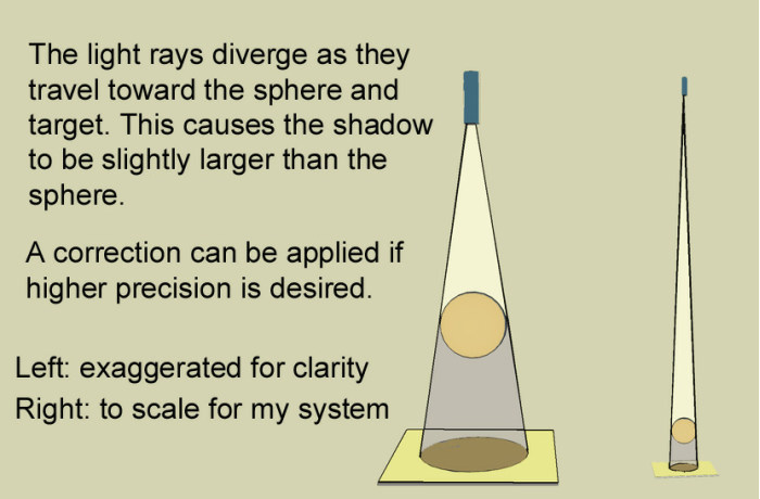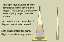For a typical setup, the diameter of the shadow will be about 10% larger than that of the sphere. If that difference is not important to your work, you may skip this section. Otherwise, press on.