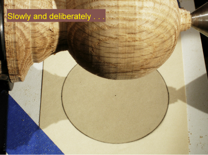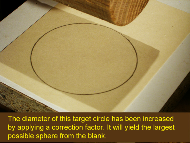 The idea is to use a small spotlight mounted above the lathe to cast a shadow of the blank onto a target circle located underneath it. To turn the sphere, simply remove wood until the shadow of the blank fits inside the target circle.