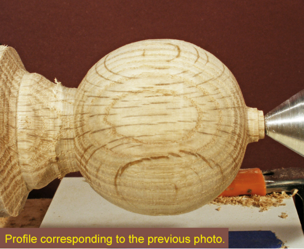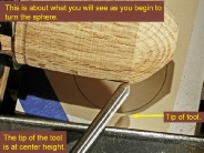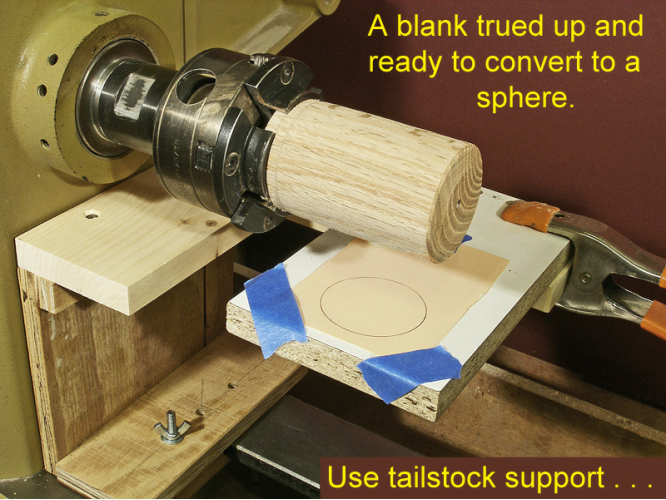 This is the easiest and most direct method for turning a sphere, in my opinion. No marking on the blank nor rechucking between cup centers is required. You get instant feedback as you turn the blank from a cylinder to a sphere.
