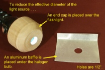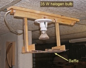 Note: A halogen lamp gets really hot. If you use one, do not use cardboard for the baffle; it will catch fire in short order. I used thin aluminum, the kind used for flashing when you install a roof. Also, the construction is open so that air can circulate freely around the bulb and socket. There is no reason to enclose the bulb.