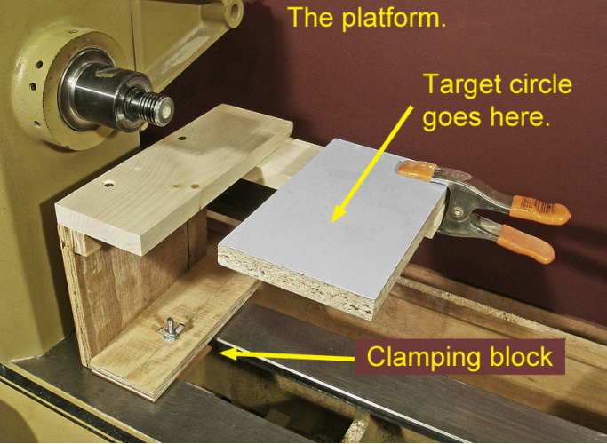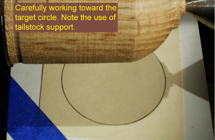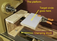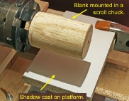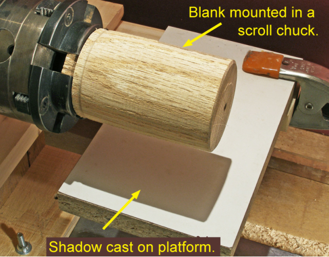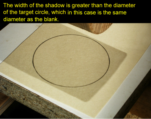 On an index card or other piece of card stock, draw the target circle. Carefully center the circle in the shadow of the cylinder and tape the card to the top of the platform. Locate the circle a short distance back from the end of the blank to avoid having the dimple made by the point of the live center appear on the surface of your sphere.