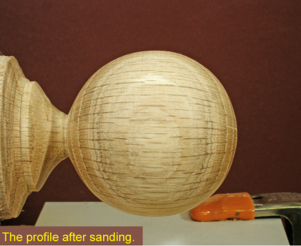 If you use a soft pad with the lathe turning slowly, the sandpaper will conform to the surface of the sphere and make it less likely that you will create a flat spot if you happen to linger a bit too long in one area.