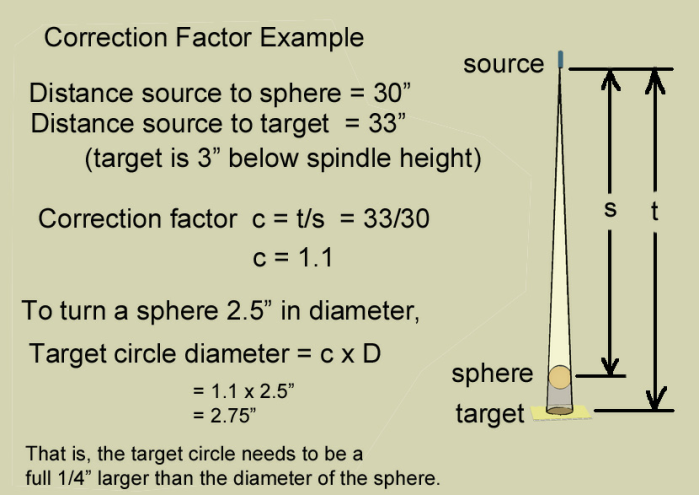 A correction factor ( c ) can be calculated for your system based on the distance the light source is above the spindle and how far below the spindle the top surface of the platform and target circle is: